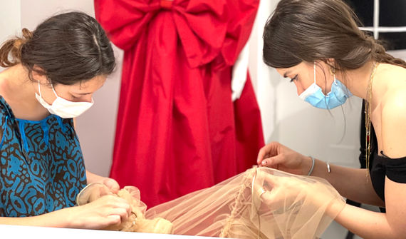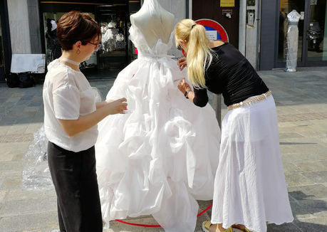 Giulia e Maria, allieve del corso professionale 2020/21, sono state coinvolte in un'attività extra scolastica che le ha viste partecipi nella realizzazione di questo bellissimo abito sulla base di un bozzetto preparatorio di Jana Grossmann. Le alunne hanno acquisito la conoscenza necessaria per la lavorazione di tessuti delicati e pregiati come il pizzo e il tulle.
